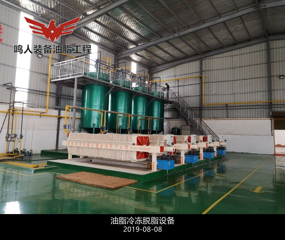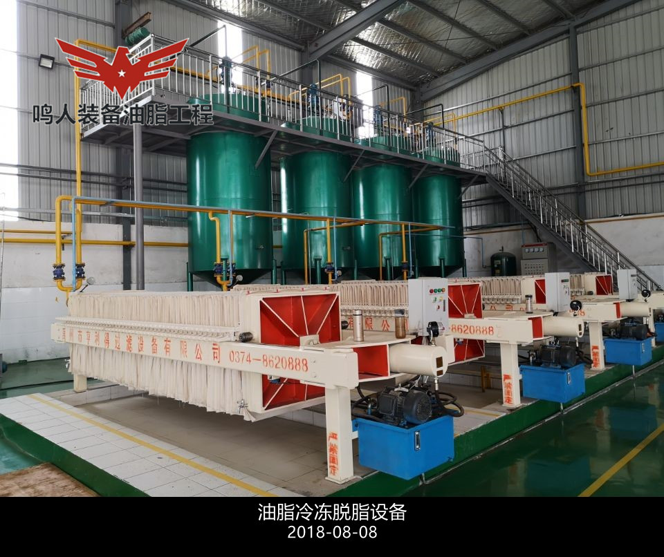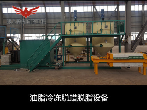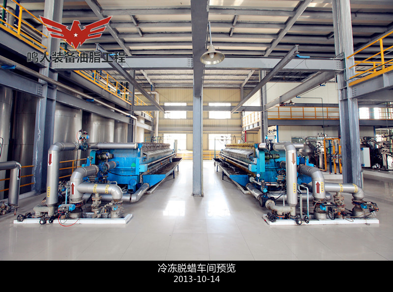 低溫脫蠟即單靠冷凍結(jié)晶,然后用機械方法分離油、蠟而不加任何輔助劑和輔助手段的脫蠟方法。分離時采用加壓過濾、真空過濾和離心分離等設(shè)備。此法**簡單的是一次結(jié)晶、過濾法。將脫臭后的油脂(溫度在 50℃以上)移入有冷卻裝置的結(jié)晶養(yǎng)晶罐,慢速攪拌,在常壓下充分冷卻,整個冷卻結(jié)晶時間為48h,然后過濾分離油、蠟質(zhì)。過濾壓強維持在 0.3–0.35MPa,過濾后要及時用壓縮空氣吹出蠟中夾帶的油脂,濾出的油即為脫蠟成品油。